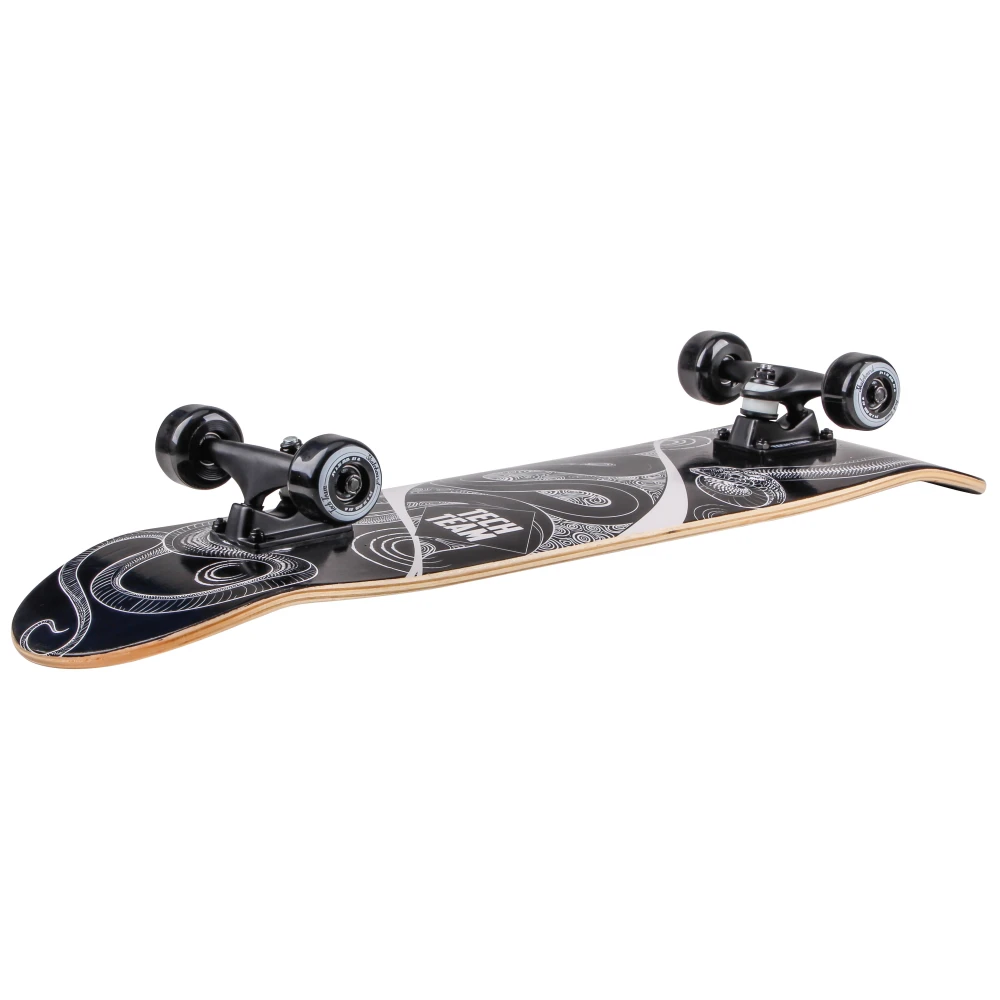 Дека скейтборда широкая, допускает размещение 2-х стоп взрослого пользователя. Размеры по длине и ширине составляют 31 дюйм и 11,5 мм соответственно. Наличие двойного концевого изгиба делают отскок качественным и безопасным.