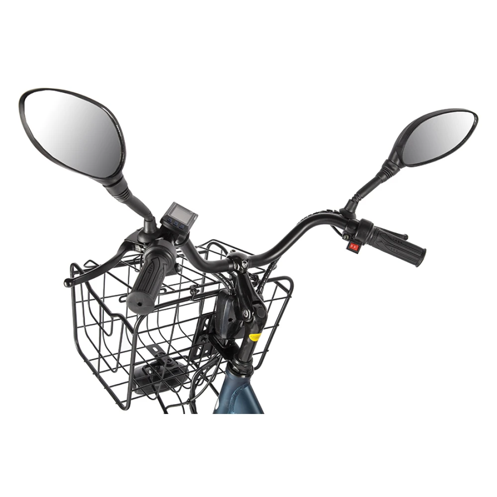 Велогибрид имеет устойчивые колеса диаметром 20 дюймов, достигает скорости в 35 км/час, выдерживает нагрузку в 120 кг. Выполнен в красивом темно-синем цвете.