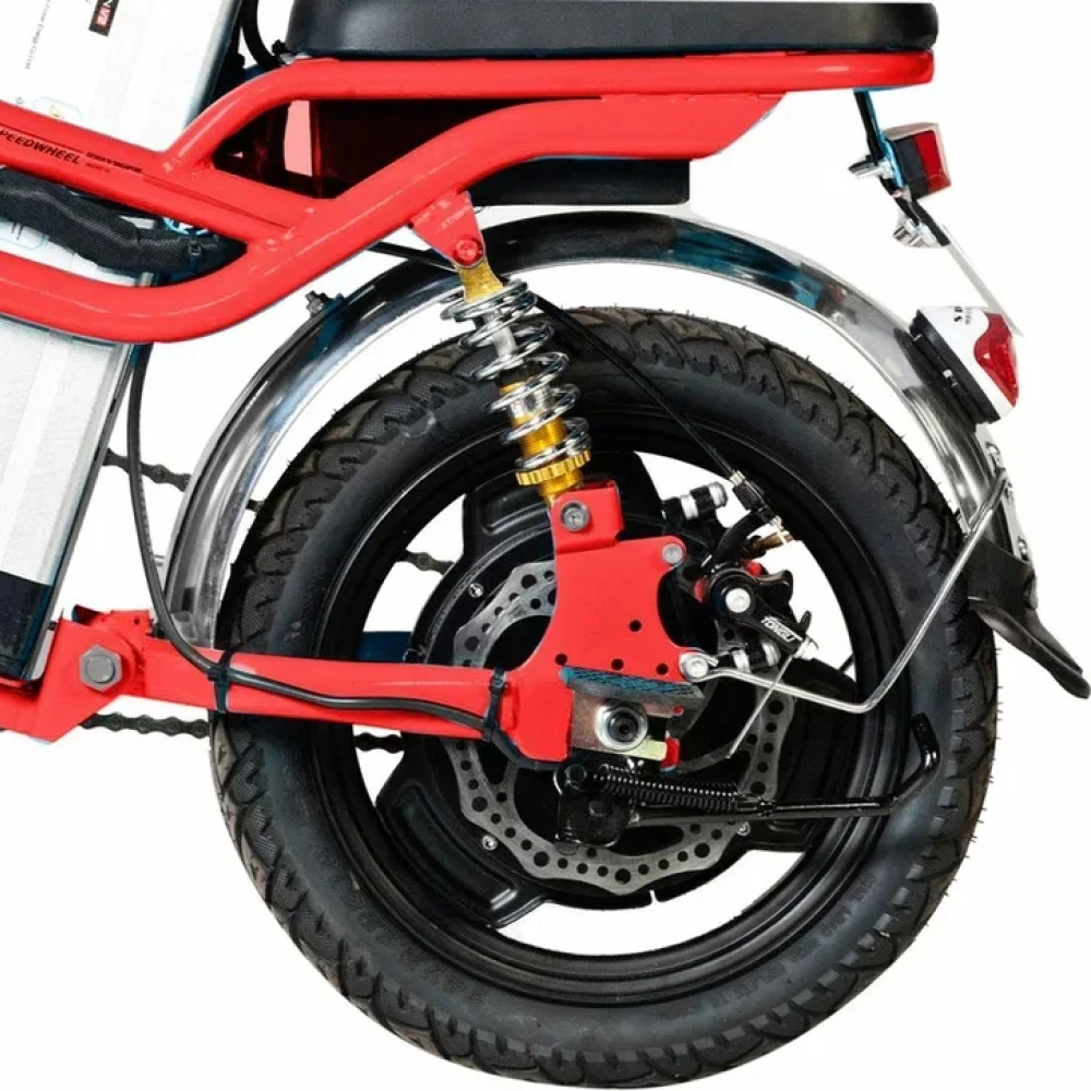 Электровелосипед оснащен движком мощностью 350 Вт, способным развить скорость до 45 км/час и преодолеть 50 км пути на одной подзарядке. Литий ионная батарея 12Ah48V – быстросъемная. Время полной зарядки составляет 5 часов. Расположена в специальном блоке, за седлом ездока.