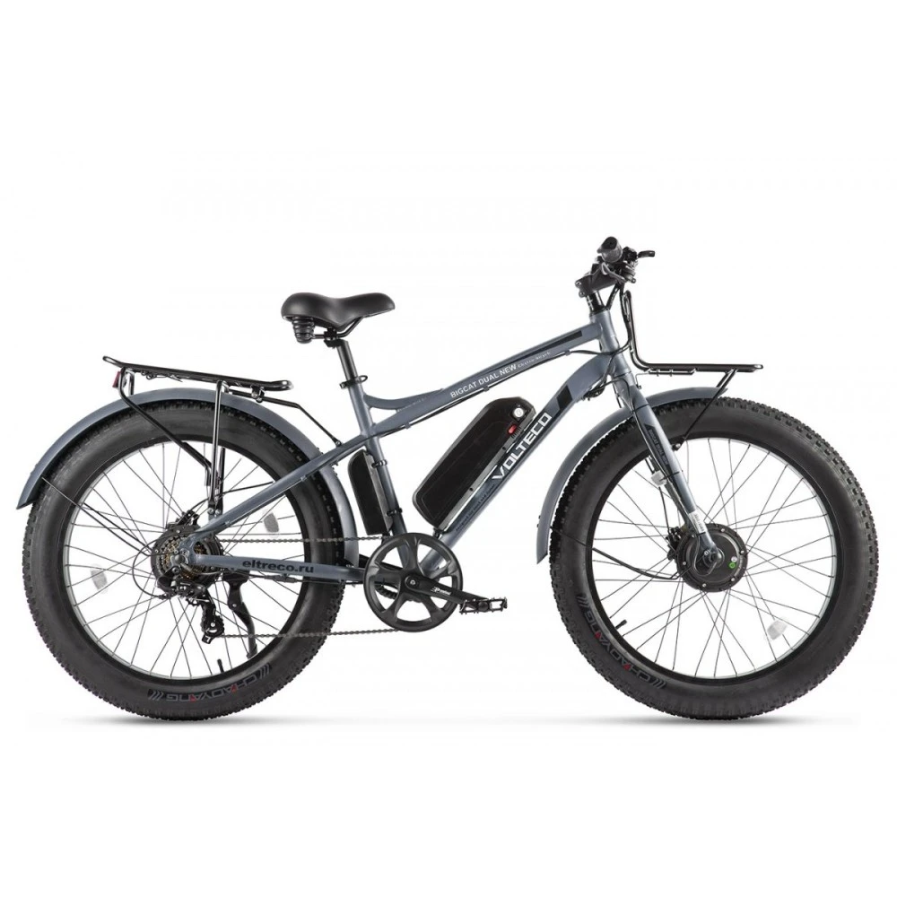 Одна из уникальных, доступных по цене моделей электровелосипеда VOLTECO BIGCAT DUAL NEW от проверенного производителя, серого цвета. Популярна среди мужчин любителей экстремальной езды по бездорожью. На нем можно проехать достаточно большое расстояние до 50 км, не заряжая дополнительно аккумулятор. Мощность электродвигателей составляет 2х500W. С полным приводом и 7 скоростями. Легко разгоняется до 45 км в час и за счет дисковых гидравлических тормозов быстро останавливается. Маленький, легко подвижный с весом 31 кг удобный в использовании, транспортировке, хранении. В уходе прост и неприхотлив.
