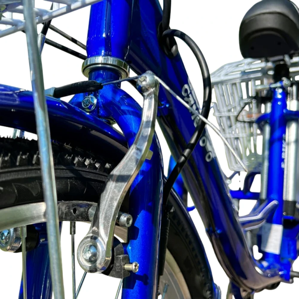 Мотор BLDC 350 Вт (переднее мотор-колесо): Разгон до 25 км/ч, подъём 15% под нагрузкой — уверенно на холмах. АКБ литиевый NMC 48V 12Ah: 576 Вт·ч, заряд 7-8 ч (2A), реальный пробег 40 км (город 30 км, груз 20 км). 3 режима ассистента: эконом (20 км/ч, 40 км), стандарт (25 км/ч, 30 км), мощный (25 км/ч, 25 км). V-brake спереди + диск сзади — тормозной путь 4 м. R24 шины — энергоэффективны на асфальте.